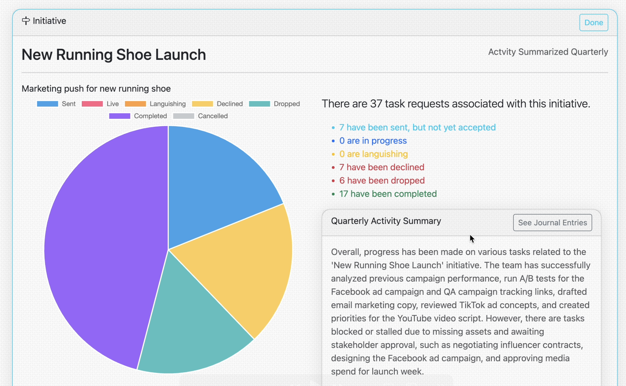 Initiatives aggregate task requests and tasks, and provide at-a-glance status and summarization of activity for all of those task requests and tasks. Coule uses AI to summarize journal entries made to requested tasks associated with an Initiative. You (or your boss) can look at an Initiative and instantly get a feel for what's going on. Which means you don't need a meeting about it.